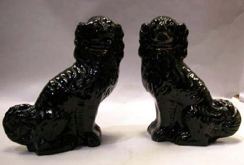 A PAIR OF STAFFORDSHIRE EBONIZED SPANIELS;