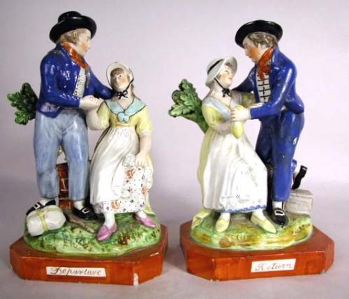 A PAIR OF STAFFORDSHIRE FIGURINES; One titles "Departure," the other "Return," tallest 8 3/4"h, losses & repair