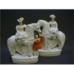 A PAIR OF STAFFORDSHIRE FLATBACK FIGURE GROUPS, 19th Century, seated woman on horse with small girl at her side, height 34cm (2) (s.d.) 50-60
