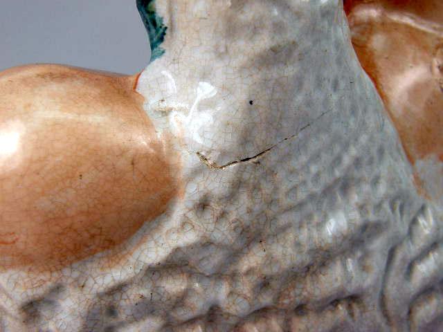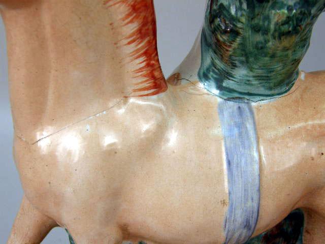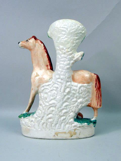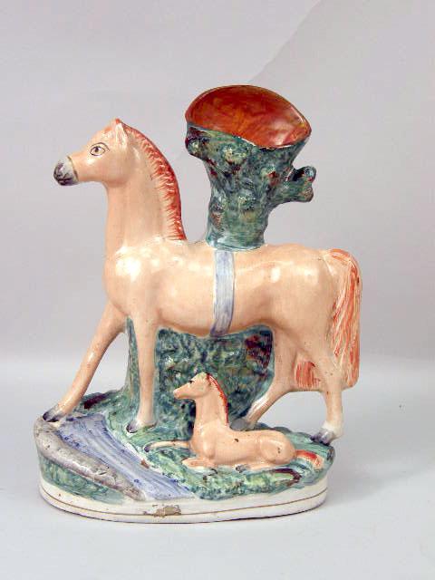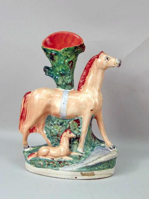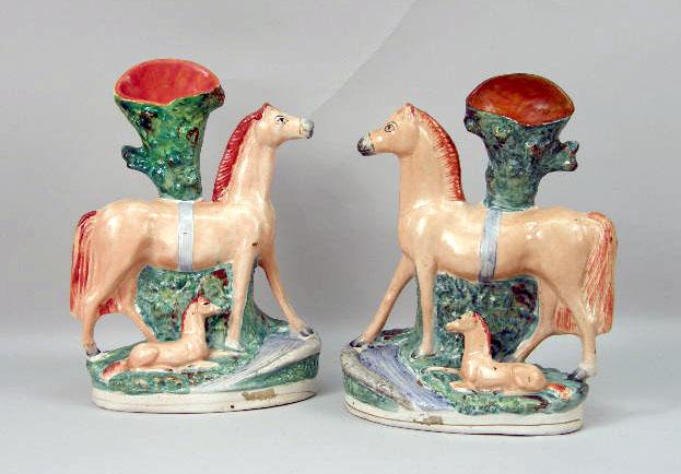 With mare and foal figures. 13 1/2"h x 8"w One with repaired crack to horse`s neck, interior spill vase restored, craquelure and wear.