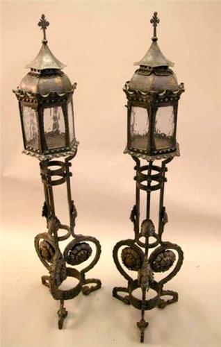 A PAIR OF STEEL AND GLASS LANTERNS; With hexagonal shades on leaf-decorated stands 4'6"h