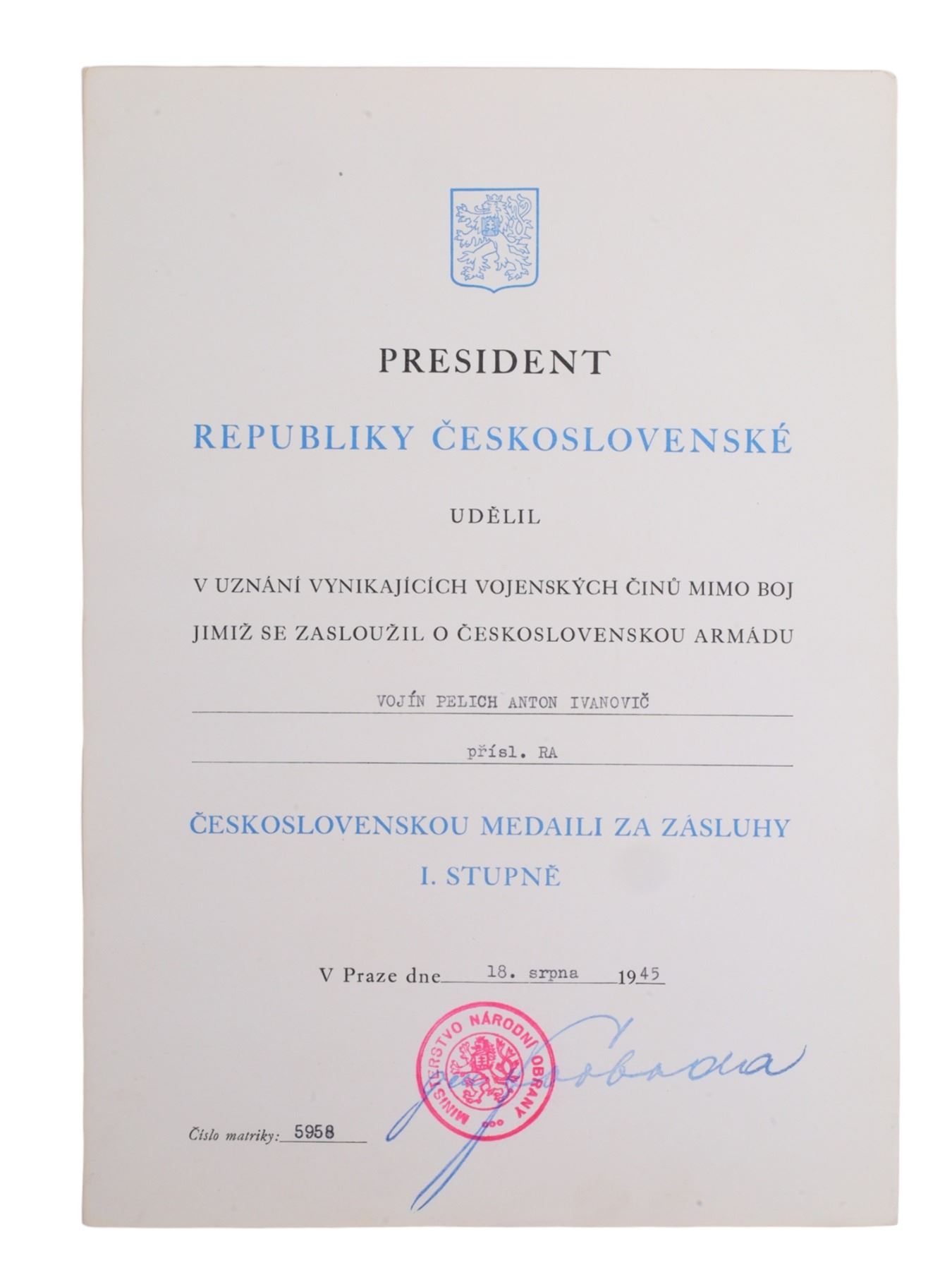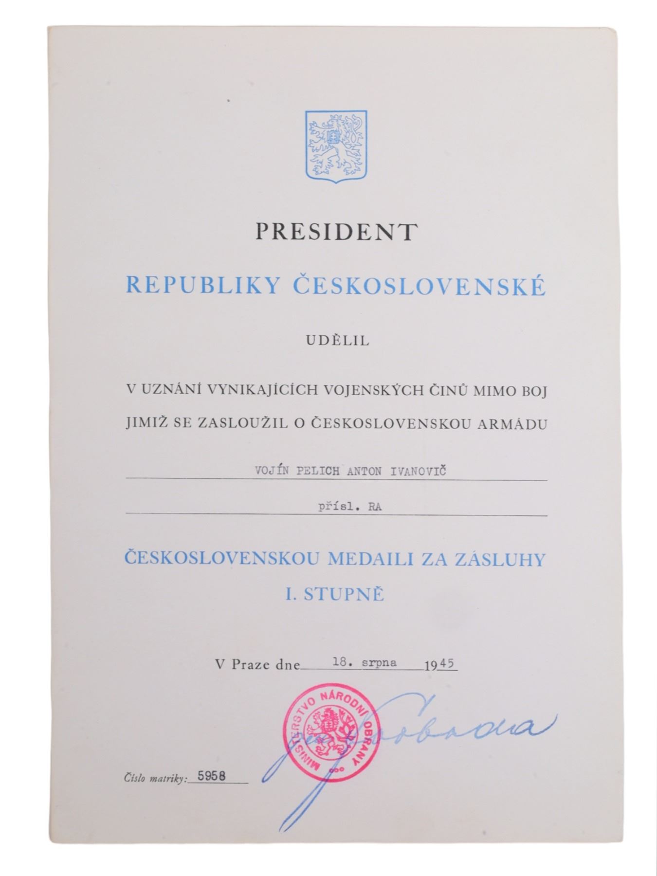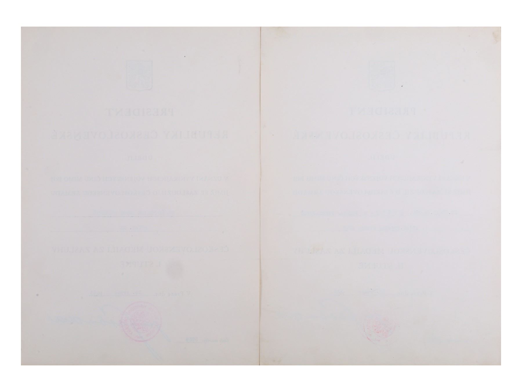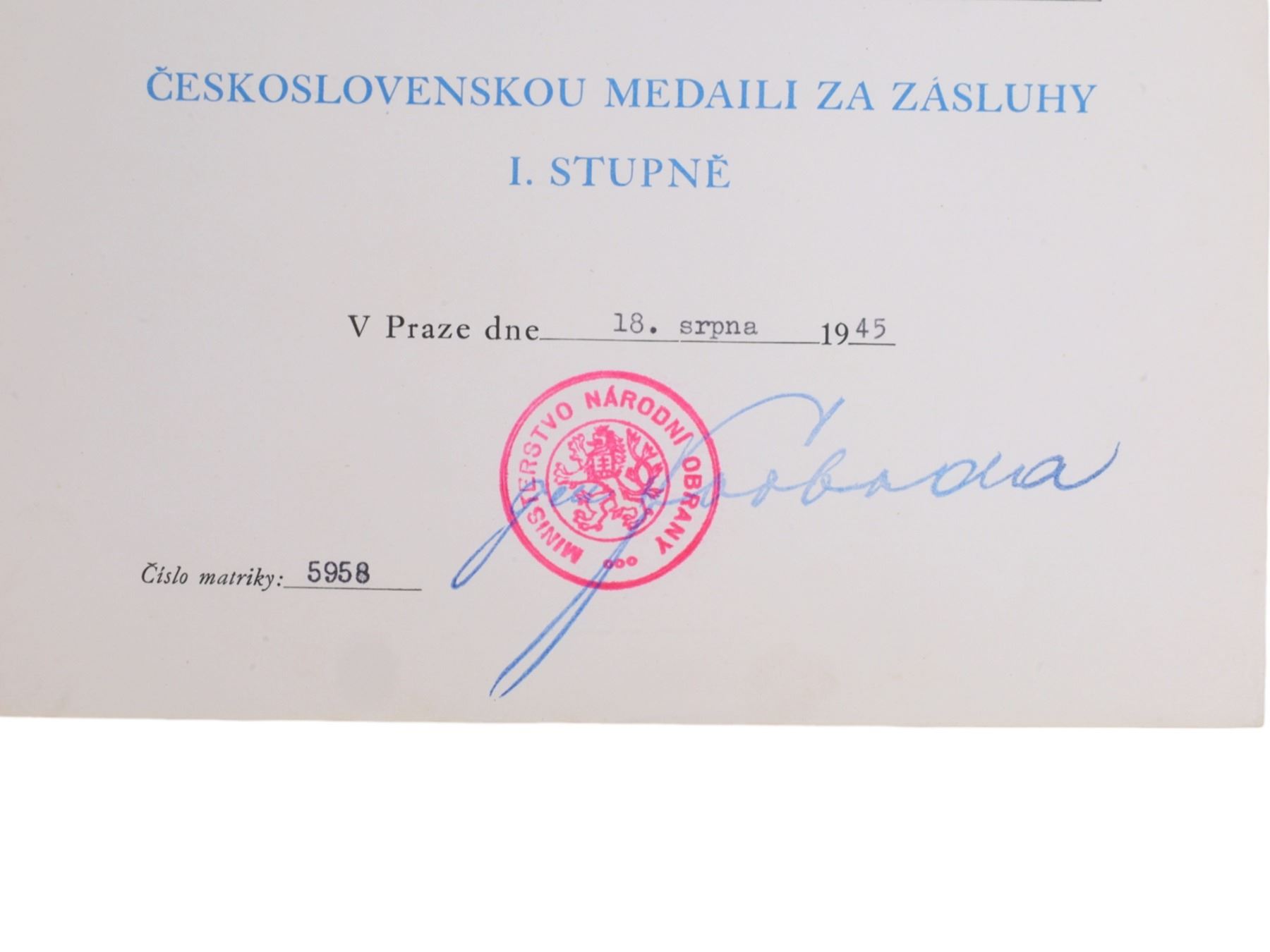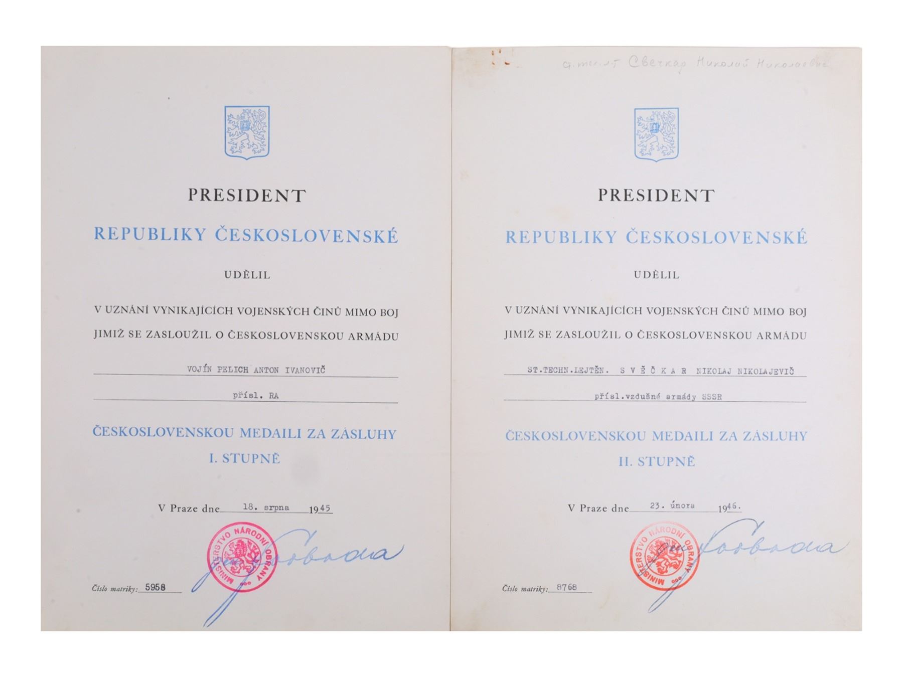 A pair of Czechoslovakian award citations for the 'Medal for Military Merits' 1st and 2nd class, issued by Ludvík Svoboda to two Red Army personnel. Each document has the signature and handstamp of Svoboda at its bottom.