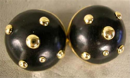 A PAIR OF TRIANOM 18K YELLOW GOLD & EBONY CIRCULAR EAR CLIPS; 1-1/8"dia.