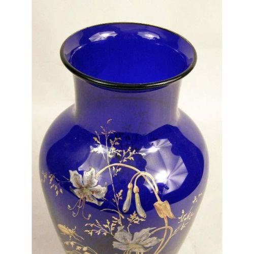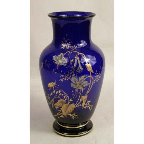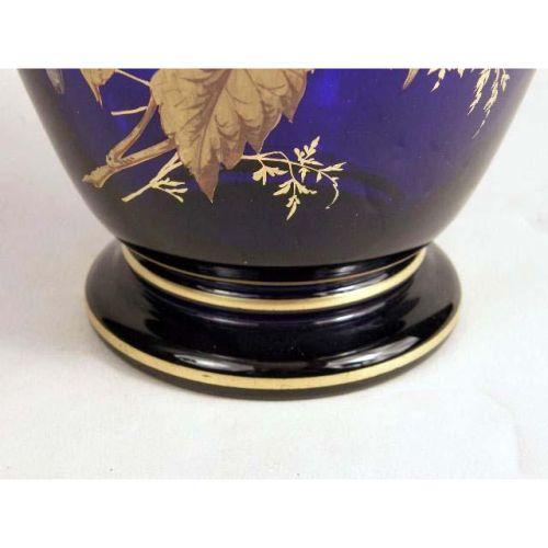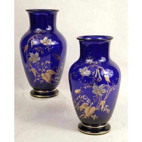 A PAIR OF VICTORIAN FLORAL GILT PAINTED COBALT BLOWN GLASS VASES<BR><BR>12"h