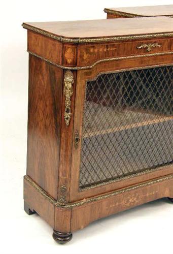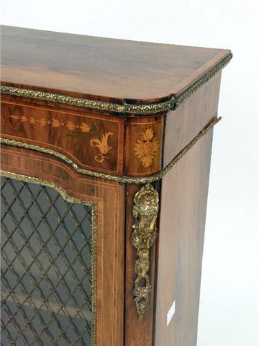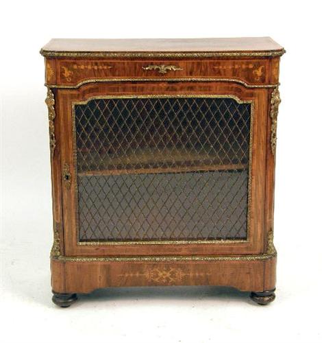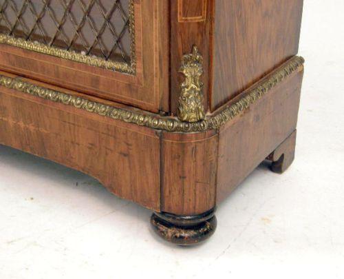 Rosewood veneer, brass mounts, glass and grill doors, velvet-lined interior. 34"h x 30"w x 14"d