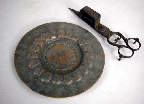 A PAIR OF VINTAGE BRASS CANDLE SNUFFERS; Together with a copper embosses plate