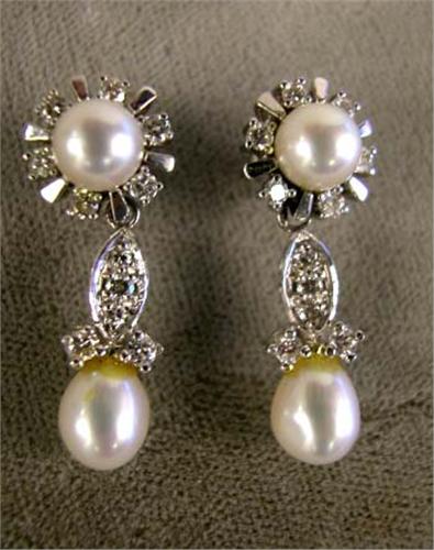 A PAIR OF WHITE GOLD DIAMOND AND PEARL EARRINGS;