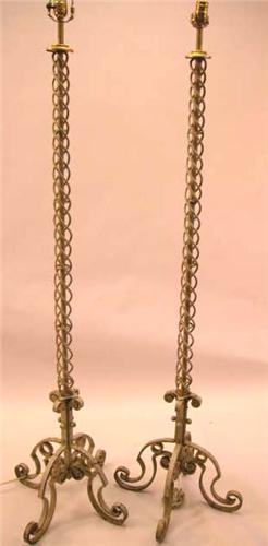 A PAIR OF WHITE PAINTED STEEL FLOOR LAMPS; Each with an open barley-twist shaft and scrolled toes (Paint chipped) 5'9"h