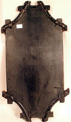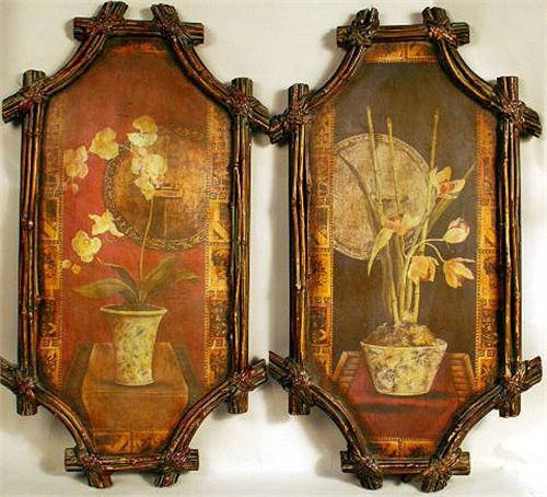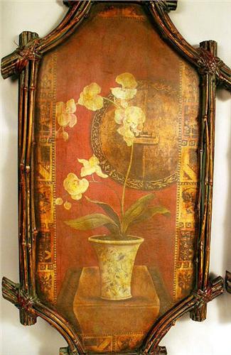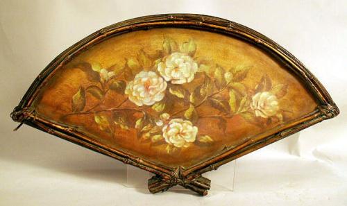 Each depicting a floral still life, frames retain traces of green paint. Wear and minor losses. 32 1/2"h x 17 1/2"w. Together with a similar fan shaped example. 3 pieces.