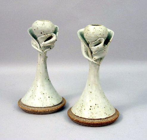 A PAIR OF "WINDFALL" ART POTTERY CANDLE HOLDERS