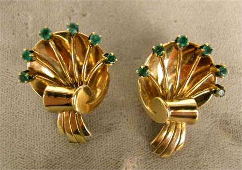 A PAIR OF YELLOW GOLD AND EMERALD RETRO EARRINGS; 1-1/8"h