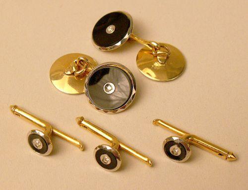 Garnets are possibly Hessenite. Weight approximately 5.9 dwt. Together with a group of gentleman`s jewelry including a 14K yellow gold ridged tie bar, a pair of 14K yellow gold cufflinks, a 14K yellow gold wedding band engraved 12-7-45, a 14K yellow go