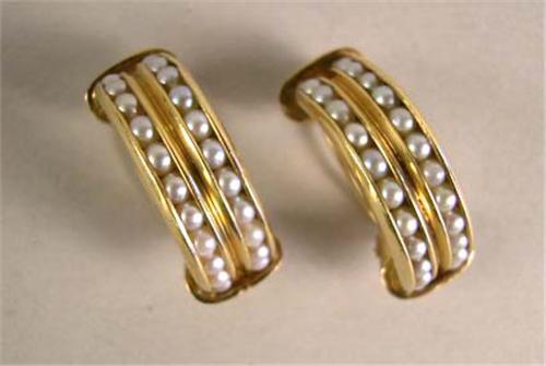 A PAIR OF YELLOW GOLD AND SEED PEARL EAR CLIPS;