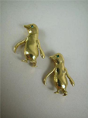 A PAIR OF YELLOW GOLD PENGUIN BROOCHES, each with small green stone eyes, 1"l, 4.dwt
