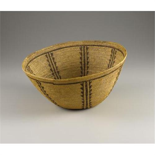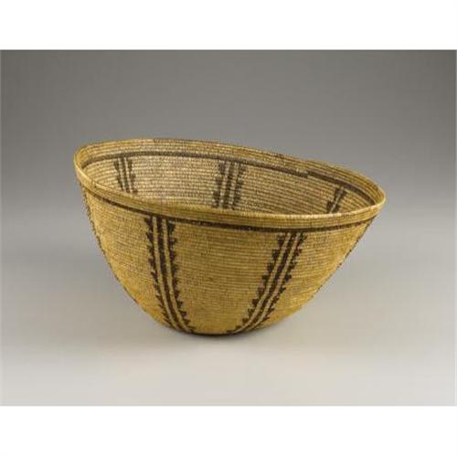 <B>A PANAMINT COILED BOWL</B></I><BR><BR>c. 1910<BR> woven of willow and devil’s claw, decorated with a series of seven vertical serrated bands<BR><BR>Diameter: 13 ¾ inches <B>Condition Report:</B> Overall very good with moderate wear and soiling. 1/8" loss of rim binding. Basket sits askew. No apparent restoration.<BR><BR><b>Shipping:</b> Requires 3rd Party Shipping (<a target="_blank" href="http://www.heritageauctions.com/common/shipping.php">view shipping information</a>)
