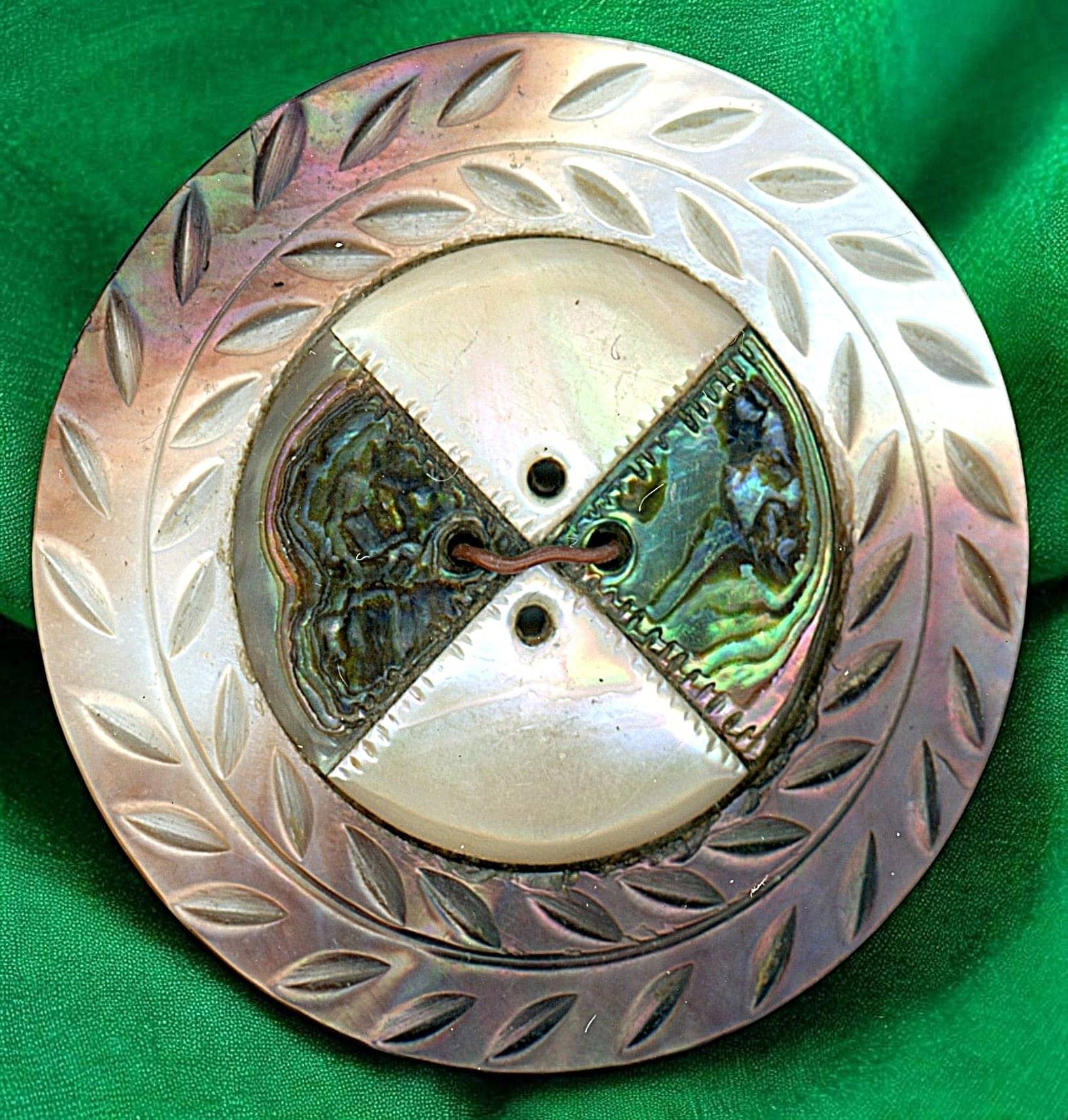 17 Medium/Large 18th-20th century examples. This partial card includes a nice engraved 18th century copper, a beautiful marquetry style big pearl with abalone, Japanese Satsuma, a lovely blue cabochon centered Gay 90 button, Vegetable Iv, Natural material, a great engraved bone in wood button of PANDAS and more.