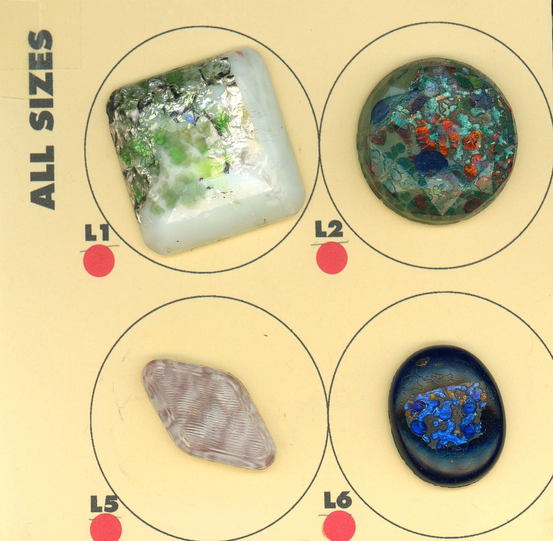 4 Medium/Large early 20th Century Leo Popper examples. Here is a small but nice selection of these desirable glass buttons from the late 19th and early 20th century manufacturer, Leo Popper of New York. Take a good look as the large hanger diamond shaped example is the enameled back Popper which are not always easy to find, as well as the multi colored large and the green and white extra large square. These are some impressive examples of Leo Popper glass buttons.