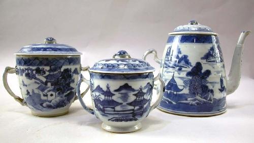 A PARTIAL CHINESE EXPORT PORCELAIN TEA SERVICE; Canton pattern, including a teapot, a covered tea bowl and a covered sugar bowl, each with a stylized crab-form knop and strap handles, teapot 6-1/2"h
