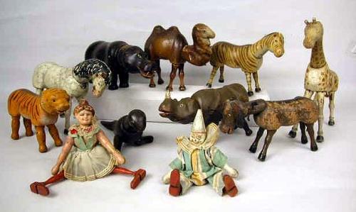 A PARTIAL SCHOENHUT HUMPTY DUMPTY CIRCUS COMPRISING: a tiger, zebra, rhinoceros, 9"l, hippo, 10"l, elephant, 6"l, giraffe, 10"h, a seal, a donkey, a camel, a horse, a composition-head clown, and a composition-head lady acrobat, all animals with painted ey