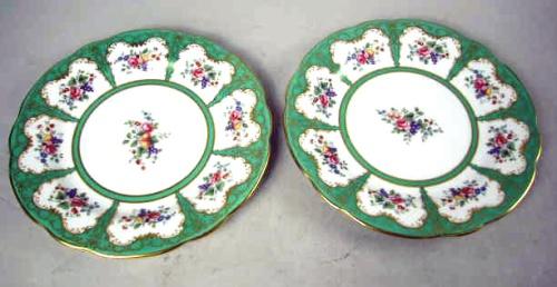 A PARTIAL SET OF AYNSLEY BONE CHINA; English, white with gilt and green border and embossed fruit motif, comprising, eight luncheon plates, 9"diameter, and eleven dessert plates, 8"diameter