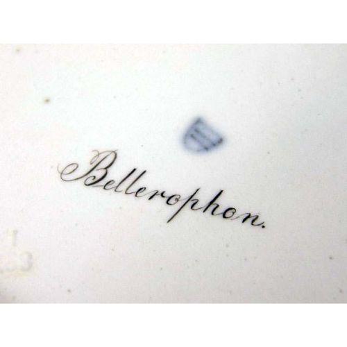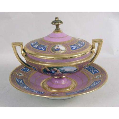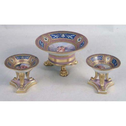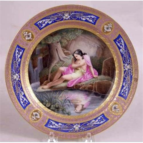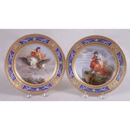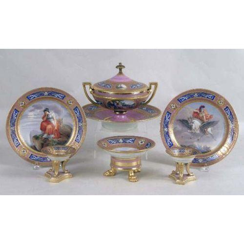 A PARTIAL SET OF IMPORTANT ANTIQUE ROYAL VIENNA PORCELAIN FROM THE RUSSIAN IMPERIAL EXHIBIT<BR><BR>White with lavender and gilt and cobalt blue decoration, centrally painted with angelic couple and other mythological subjects, blue beehive mark, impressed 817 80, comprising: a small footed bowl on paw feet, 3-1/4"h x 5-3/4"dia., a pair of footed salts, 2-3/4"h x 3-1/4"dia., impressed 12 827, covered tureen with underplate, brass finial, 8"h x 6"dia., underplate, 9-1/2"dia., , and 5 dessert plates, signed on back "Apollo", "Janymedes", "Narkifsos", "Bellerophon", "Sappho", chipped 827 13, 49, 46, 15, 13, 8"dia., Provenance: original tags labeled for each piece, ie, I.P.F. Alexander I, Russian Imperial Exhibit, "Desert Alexander III, 1887 Original Alexander I, Russian Imperial Exhibit", Desert Alex. III replacement Winter Palace Russian Imperial Exhibit" 10 pieces