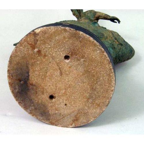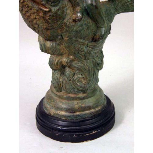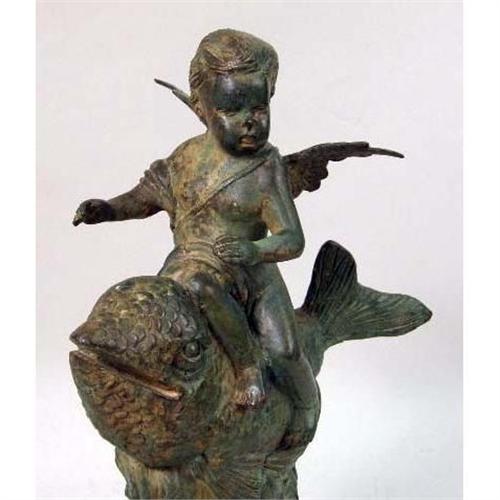 A PATINATED BRONZE SCULPTURE<BR><BR>Depicting a cupid on a fish on stand, 17"h