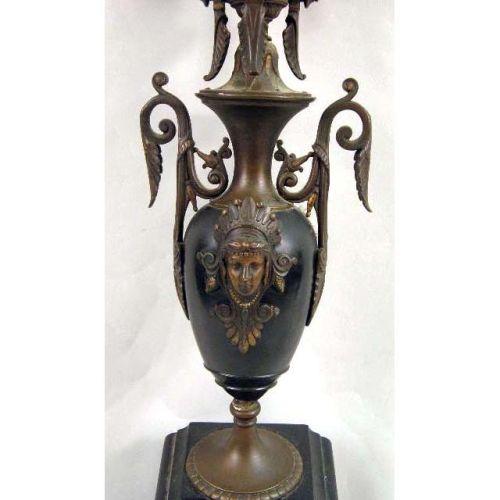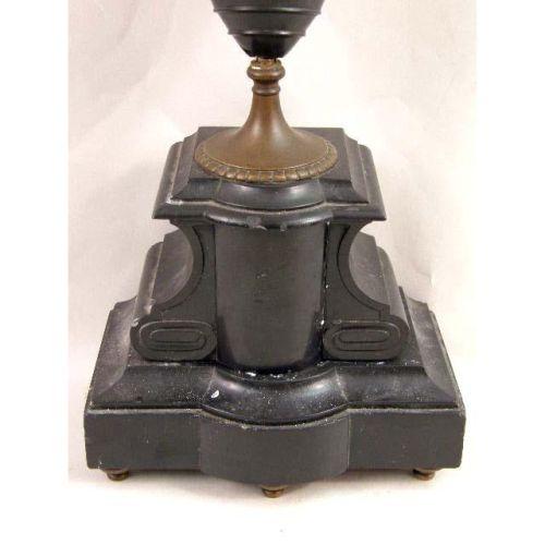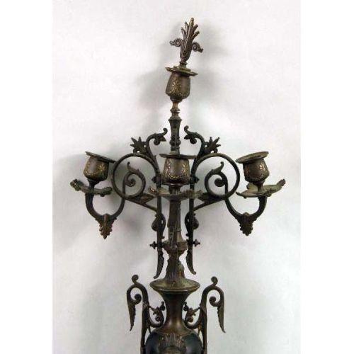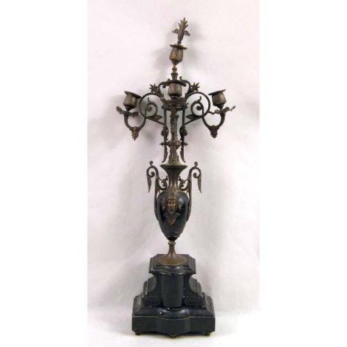 A PATINATED METAL AND HARDSTONE FOUR-ARM CANDELABRA<BR><BR>Base repaired, arm broken off, top separated from base, 29-1/2"h