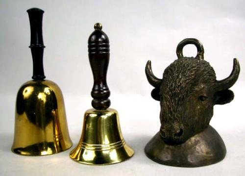 A PATINATED METAL BUFFALO HEAD BELL; Together with two other bells (losses)