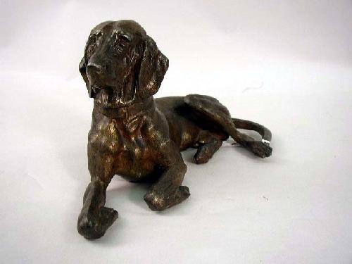A PATINATED METAL FIGURE OF A HOUND DOG; 13"l