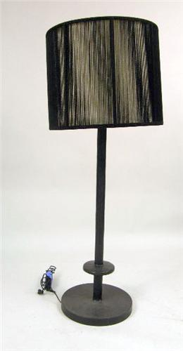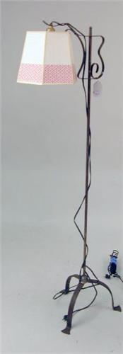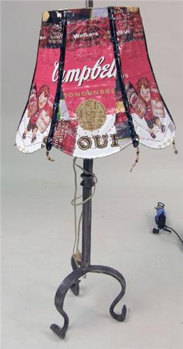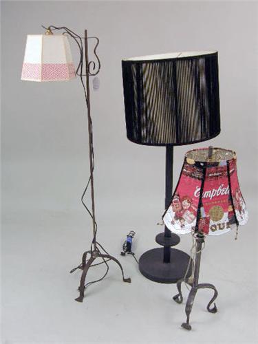 With punched tin shade with "Campbell Soup" logo. Together with a painted metal floor lamp and another patinated metal floor lamp. 2 pieces. From 38"h to 56"h
