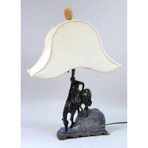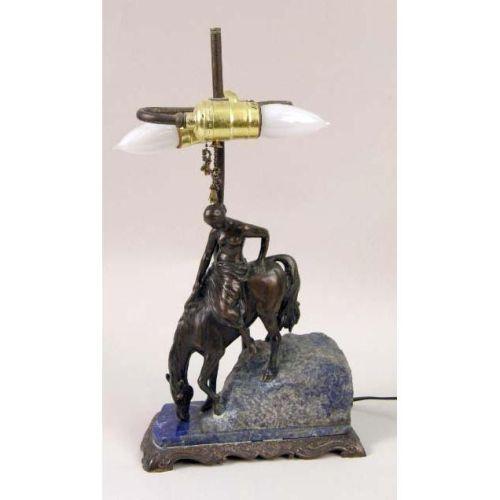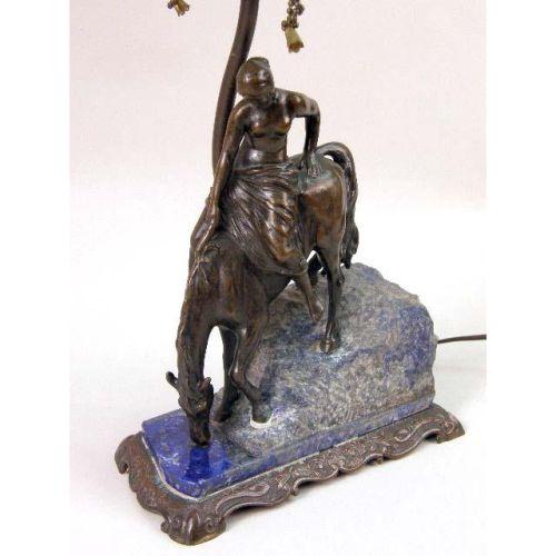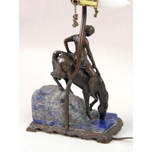 A PATINATED METAL SCULPTURE<BR><BR>Of a drinking horse, mounted on lapis and fitted as a lamp, wear, 20-1/2"h x 8-1/2"w x 4"d