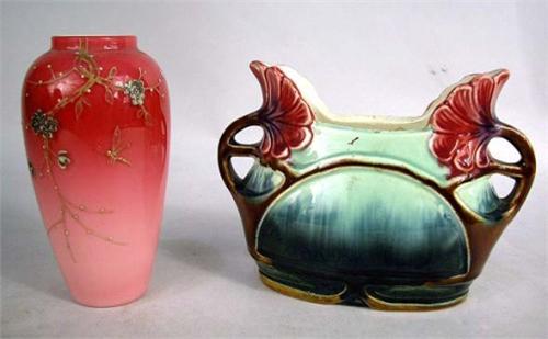 A PEACHBLOW ENAMEL AND GILT DECORATED VASE; Floral foliate motif, with dragonfly, marked at base 13., together with a handled ceramic flat vase, green ground, maroon and brown branch motif, 4-1/2"h