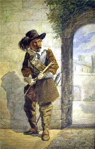 A PEN AND INK ON PAPER; depicting a tavern scene with a bored cavalier, signed l.r. C. Leandre (Charles Lucien Leandre, French, 1862-1930), and with a brass plate affixed to the frame. Together with a watercolor on cardboard of a cavalier, signed l.l. P.