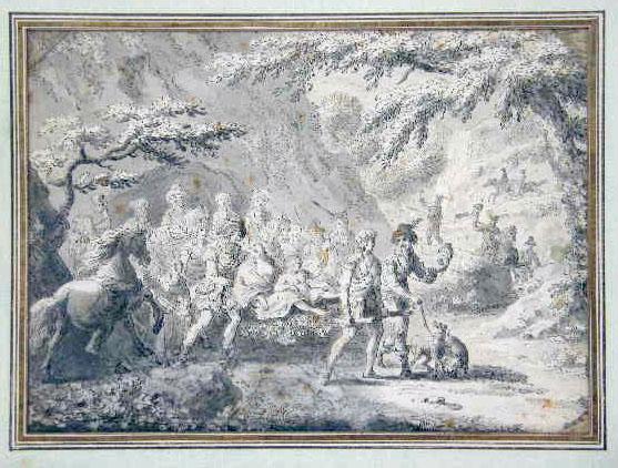 Unsigned, but an old ink note verso ascribing it to the German engraver Johann Georg Wille (1715-1808), to whose work it bears a strong resemblance. Depicting the hunt group being enticed by a semi-nude woman and her nude companion, who is feeding a strange gryphon-like creature, the sight of which has spooked the horse. Sight size 6 3/4"h x 9 1/4"w Slight scattered areas of staining, each corner with 1/2" paper loss where the edges were trimmed, and with repairs to each.