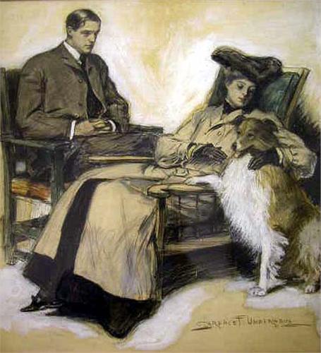 A PEN, INK, WATERCOLOR AND CHALK DRAWING; depicting a wealthy young Edwardian-era couple and their dog, signed l.r. Clarence (Frederick) Underwood (American, 1871-1929). Together with a pencil drawing, signed illegibly l.r., of a young 1920s-era couple ki
