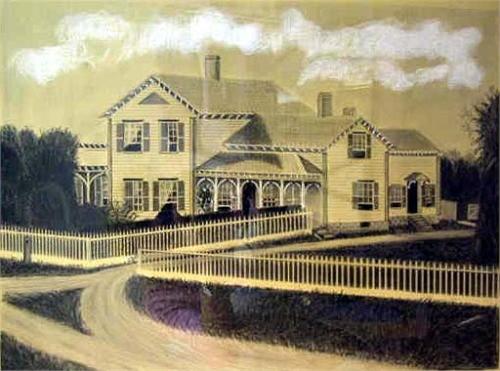 A PEN, PENCIL, INK AND CHALK DRAWING; depicting a tidy Victorian house behind a picket fence. 15" x 1 1/2"