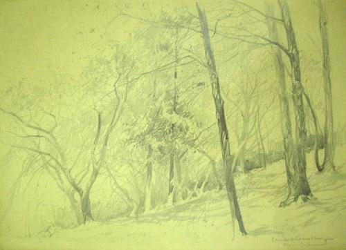 A PENCIL DRAWING ON PAPER; depicting a forest in winter or early spring, signed l.r. Charles H.(erbert) Woodbury (American, 1864-1940)/Kiev Oakwood. 11" x 13"