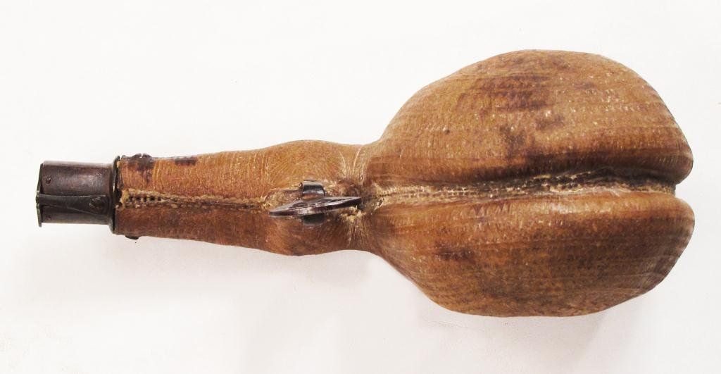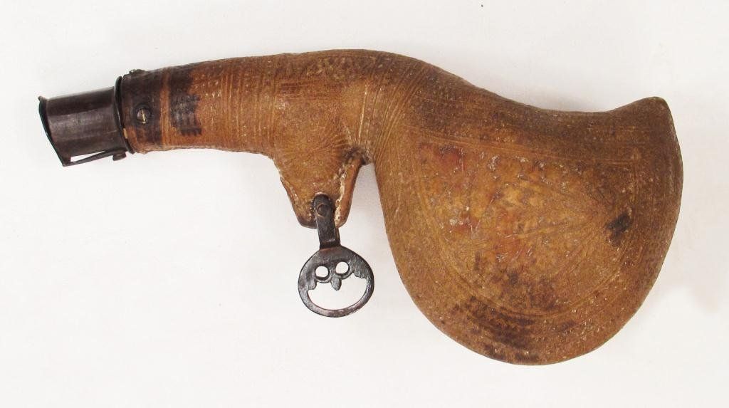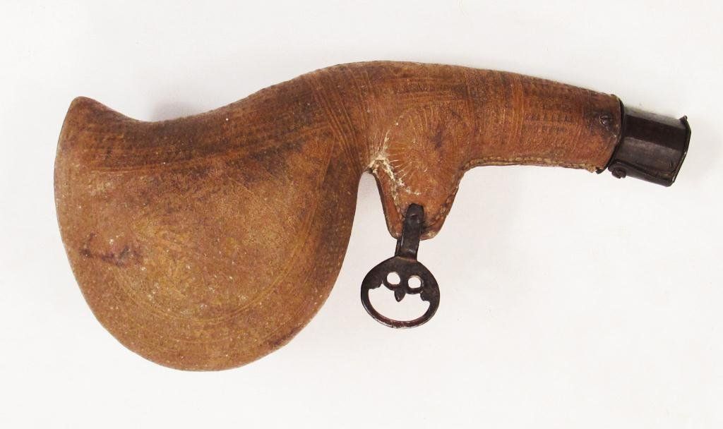 Formed of rawhide with tooled floral and geometrical motifs overall, with hinged, sprung steel cap. Mid-19th century. Overall length 29 cm. Condition I