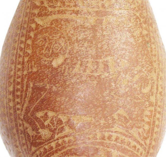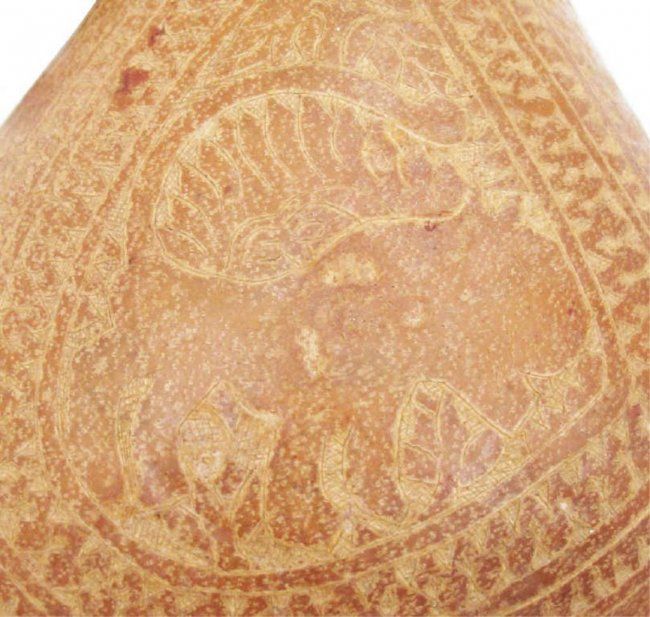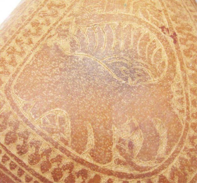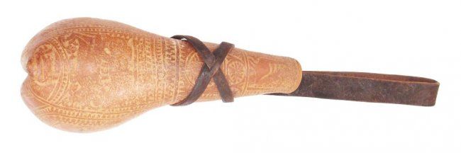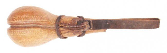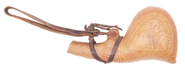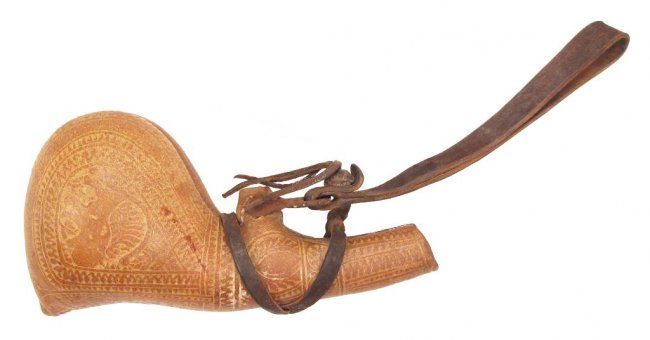 Of finely-tooled rawhide with the Persian shir-e khorshid, or lion and sun crest, and geometrical motifs overall.Retains its buckled suspension strap.Latter 19th century.Overall length 40 cm.
