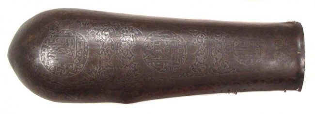 Handforged steel with etched vegetal motifs and Kufic-style inscriptions, heightened with silver inlay.Mid-19th century. Light wear. Overall length 30.3 cm.