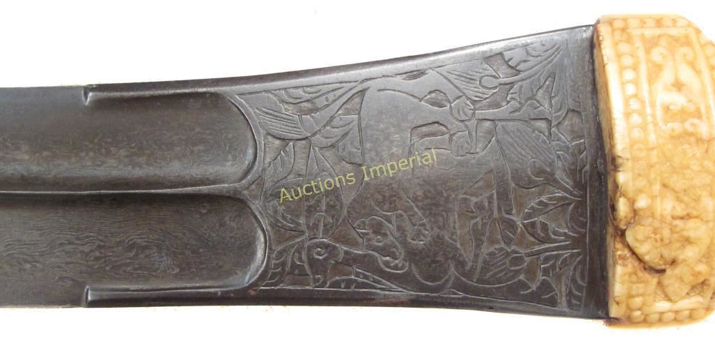 The waisted walrus grip finely carved overall with Persian kings in traditional dress in decorated arches, bordered with flowering vines. The curved, double-edged blade forged of fine Persian black wootz steel, with chiseled panel at either side of the forte depicting a lion hunting, and strong central rib. First half of the 19th century. Light wear. Overall length 33 cm.
