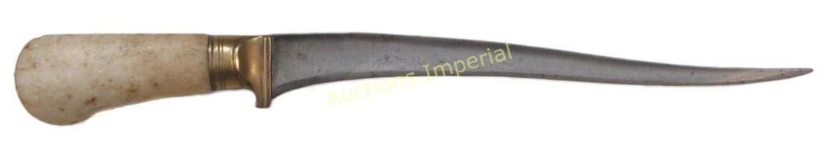 The hardstone grip with brass bolster, the graceful, recurved blade with T-back and chamfered edge, forged of fine pattern-welded damascus steel. Mid- 18th century. Overall length 37.7 cm.
