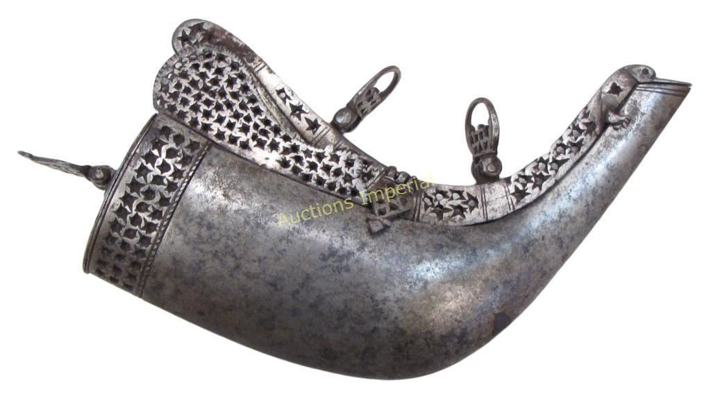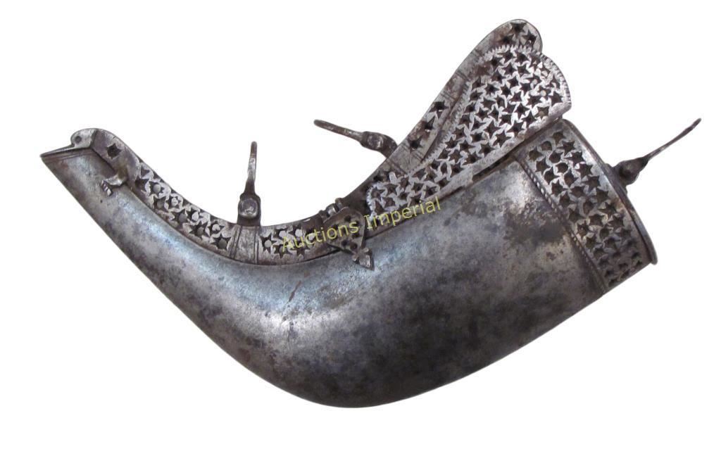 Elegantly forged in the form of a small horn, the pierced mounts terminating in a duck’s head. Actively-patterned Persian black wootz faintly visible. Late 18th-early 19th century. Some wear. Overall length 13.4 cm.