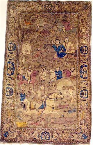 The central field depicting noblemen and a royal hunting with hounds. Some wear. Approximately 6`6"l x 4`2"w.