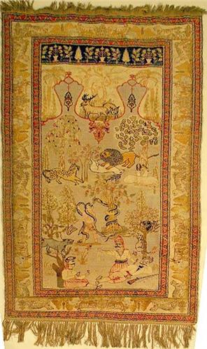 With repeating animal border and central field with hunters and various big game animals. Some wear. 6`4"l x 4`2"w.