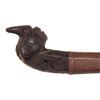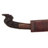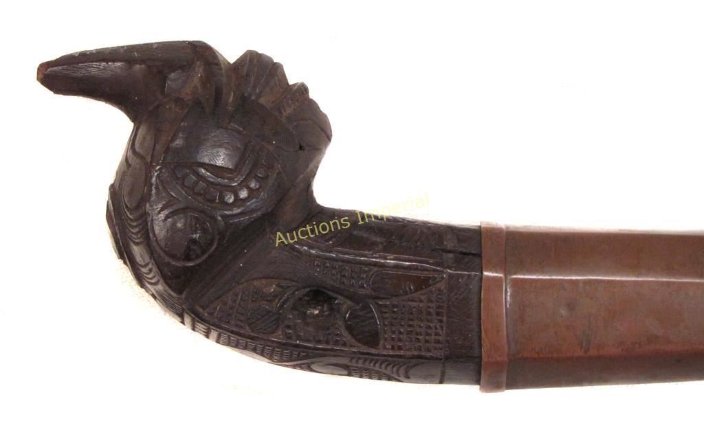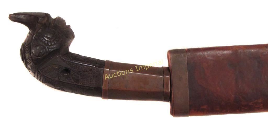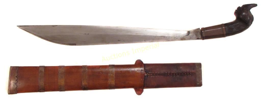 Visayan People, with elaborately-carved wooden grip, the pommel formed as a monsterhead, with copper ferrule. The heavy, handforged blade chisel-edged. In its wooden scabbard with brass mounts.Late 19th century.Worn.Overall length 59.5 cm.