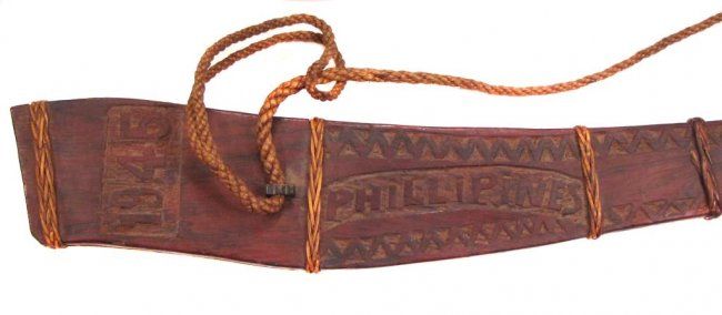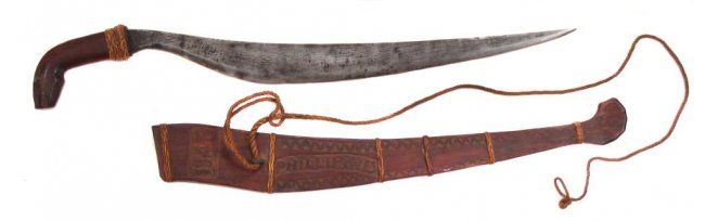 With heavy single-edged blade. In its wooden scabbard dated 1945. Overall length 55.5 cm.
