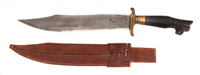 The horn grip with flared pommel, brass guard and broad blade with clipped tip struck with a maker?s mark. In its leather scabbard.WW2-era. Light wear. Overall length 42 cm.