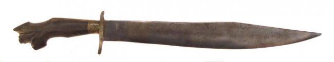 With hand-carved horn grip and brass guard, the large, handforged blade with clipped tip.WW2-era. Light wear. Overall length 47 cm.