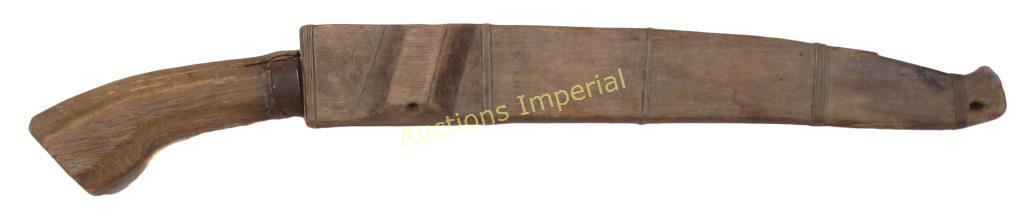 A Tabak from Luzon, with carved wooden handle and sheath. The heavy blade appears to be of laminar construction. 20th century. Overall length 49.1